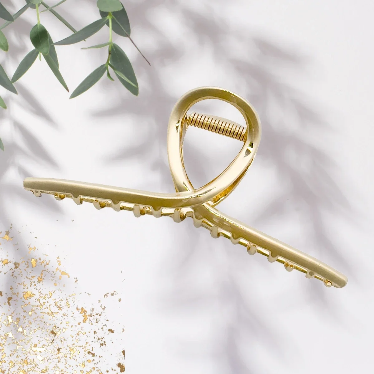 Tämä kullansävyinen hiusklipsi on näyttävä mutta hillitty asuste, joka pitää kampauksen kauniisti paikoillaan tukevan jousimekanismin avulla. Klassinen muotoilu ja kiiltävä metallipinta tuovat hiuksiin ripauksen ylellisyyttä.